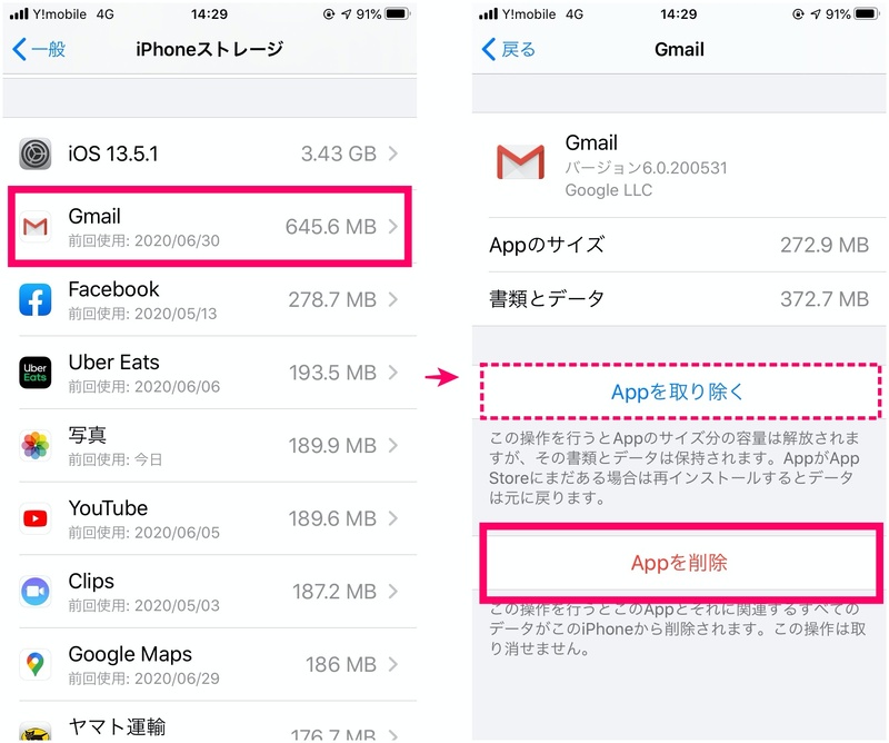 もし仮にひとつのアプリが数GB~数十GBもあれば、データをバックアップした上で削除するのがオススメです。任意のアプリを選び、「Appを取り除く」もしくは「Appを削除」をタップしましょう。