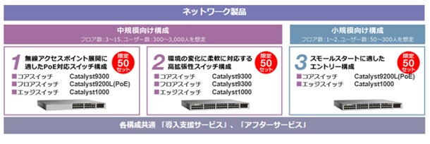 ・今ならネットワーク製品も、企業内LAN向けに機器と導入・保守・サポートサービスをパッケージ化した中規模向け構成2モデルと小規模構向け構成1モデル*3を、各限定50セット準備。