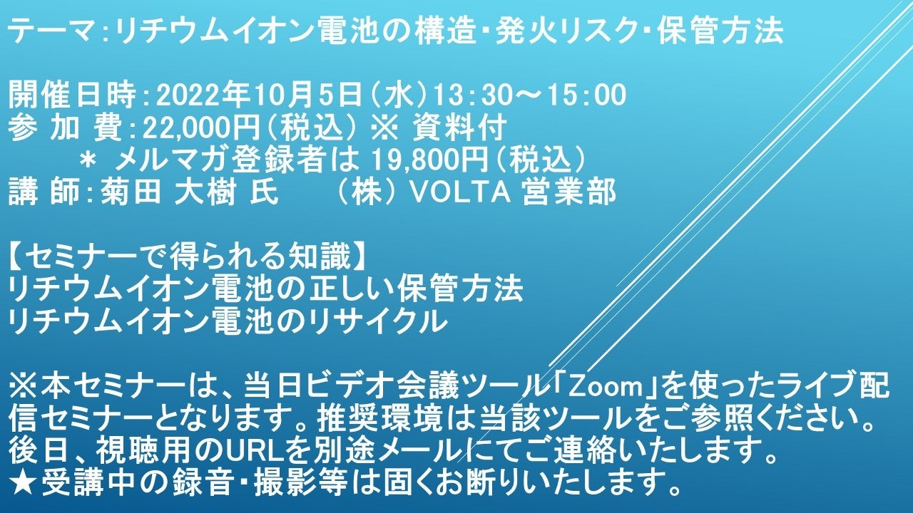 からの記事と詳細 ( 【ライブ配信セミナー】リチウムイオン電池の構造・発火リスク・保管方法 10月5日(水)開催 主催:(株)シーエムシー・リサーチ - PR TIMES )