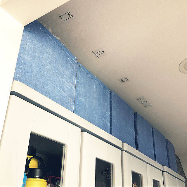 3Rさんが資源ごみの一時置き場に選んだのは、キッチンにある食器棚上のデッドスペースです。そこにボックスを並べて、種類別に分別されています。分別ラベルを箱ではなく天井に貼るアイデアは、目からウロコ!見上げれば、すぐに目的のごみ箱がわかります。