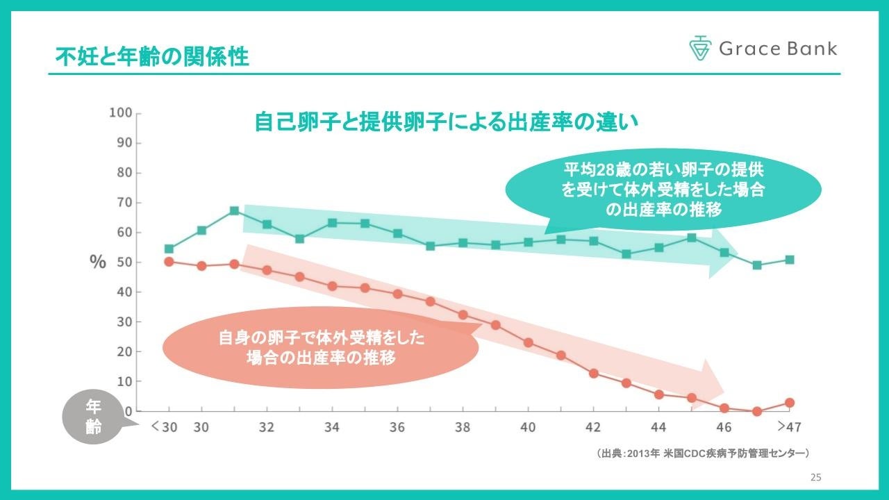 米国CDC(疾病予防管理センター)のデータによると、若い女性の提供卵子を移植した場合、40代になっても30歳以前の女性の出産率とほとんど変わりません。卵子凍結技術の進化により、採卵時の侵襲性(体に与えるダメージ)は低減、麻酔を使うことで採卵時の痛みのコントロールも可能になっており、適切な手法で凍結された卵子の融解後の生存率は90%を超えています。