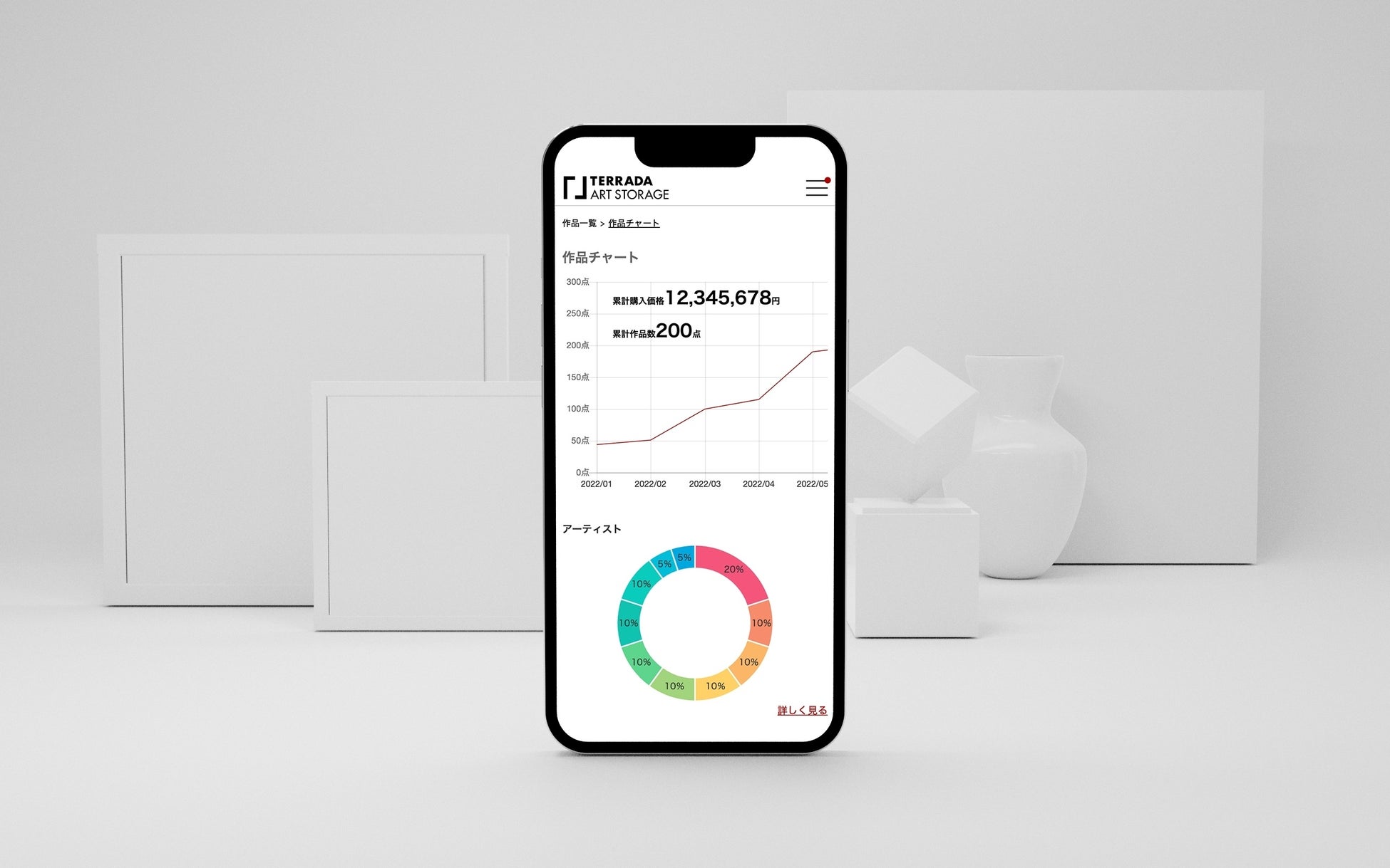 このたび、コレクション管理ツールに作品の情報がチャートで可視化される機能を新たに搭載します。チャートは、「作品単位保管プラン」で預けた作品とユーザーが登録した作品の情報をもとに、作家名・作品カテゴリ・制作年・購入年・購入価格帯・保管場所など項目別に自動生成されるため、個人のアートコレクションを俯瞰的にとらえることができます。本機能を通じて、コレクターが新たな視点でアート作品やコレクションと向き合える機会を提案します。また、新機能のリリースを記念して、TERRADA ART STORAGEに新規登録し条件を満たした方を対象に、キャンペーンを実施します。