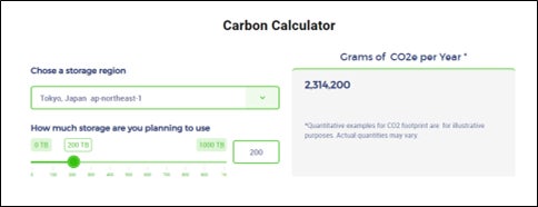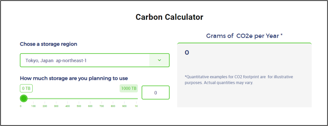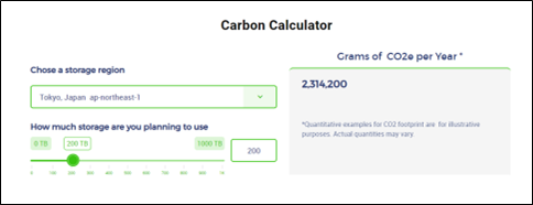 お客様やパートナー企業のESGへの取り組みを支援するため、Wasabiが新たに公開したWebベースの「カーボン フットプリント 計算ツール」は、Wasabiクラウドストレージの現在の使用容量または今後の推定使用容量を入力し、ストレージの地域を指定すると、Wasabiに1年間データが保存された場合のCO2e(二酸化炭素換算)排出量を算出することができるツールです。この計算は、データ耐久性99.999999999%を誇るWasabiの冗長化技術を含めた「実際の」ストレージに基づいています。もちろん、サーバー、ドライブ、エンクロージャ、スイッチ、ルータ―、冷却装置など、Wasabiストレージ領域に関するすべてのコンポーネントを対象としています。