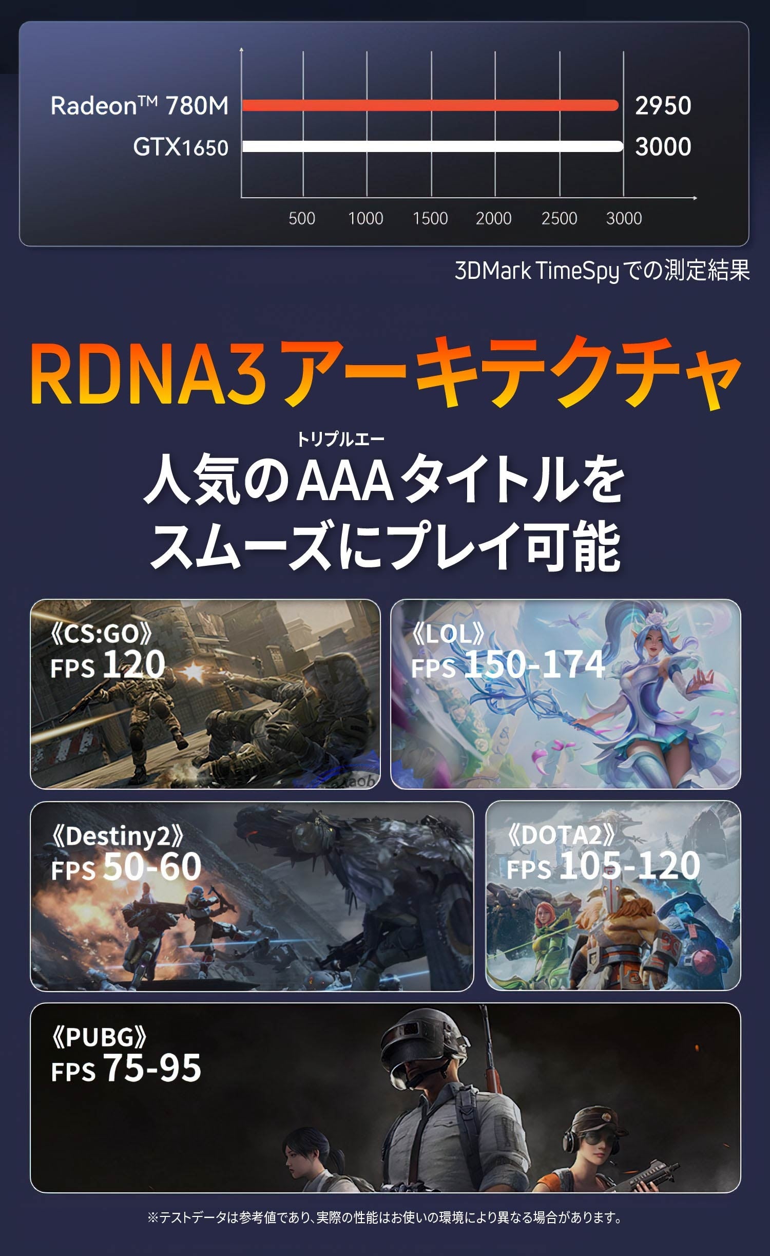 ExoRyeはRDNA3アーキテクチャで設計されたAMD Radeon™ 780M搭載。リアルな映像表現を実現する「レイトレーシング」技術をサポートし、3Dゲームを非常に美しい画質で楽しむことができます。