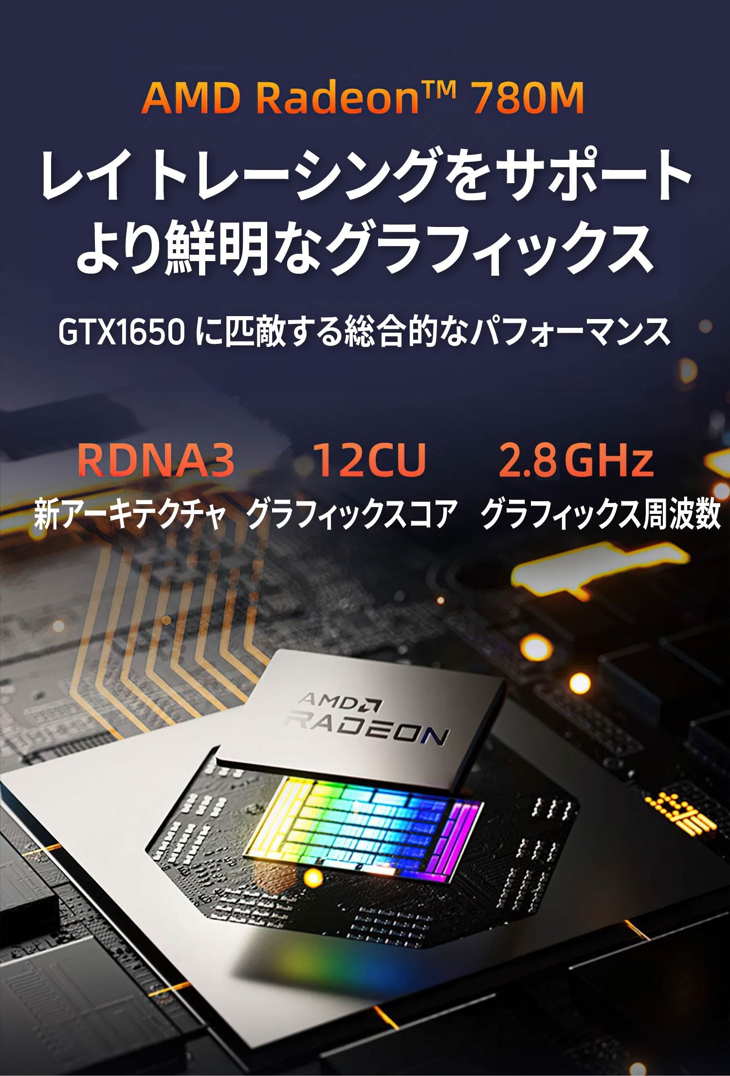 グラフィックスはAMD Radeon™ 780M、12コア、2800MHzを搭載。負荷の重いレイトレーシングにも対応し、美しいビジュアルで3Dゲームを楽しめます。また、Thunderbolt 3経由で外付けグラフィックボードを拡張することも可能。
