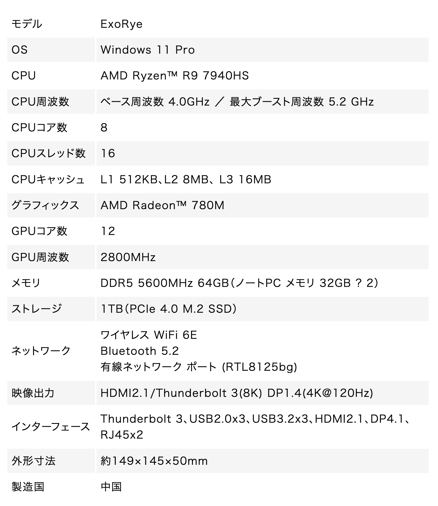 ExoRyeは最新のZen 4+アーキテクチャで設計されたAMDRyzen R9 7940HSを搭載。8コア16スレッド構成で大容量のCPUキャッシュが、重いソフトウェア処理で圧倒的なパワーを発揮します。