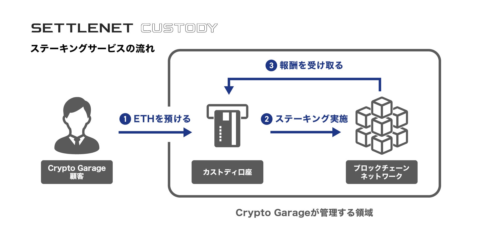 Crypto Garageは、この「SETTLENET CUSTODY」のサービスを通じ、より多くのクライアントニーズに応えるべく、機能拡充として、ステーキングサービスの提供を決定しました。