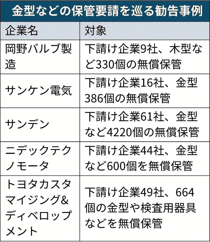 自動車や半導体関連の部品メーカーなどが、部品製造に使う金型を下請け企業に保管させていたことについて、公正取引委員会が相次いで下請法違反の勧告を出した。同法で禁じる「不当な利益要請」にあたるとの判断で、直接の取引価格以外でも「下請けいじめ」を厳しく摘発する動きとして注目される。